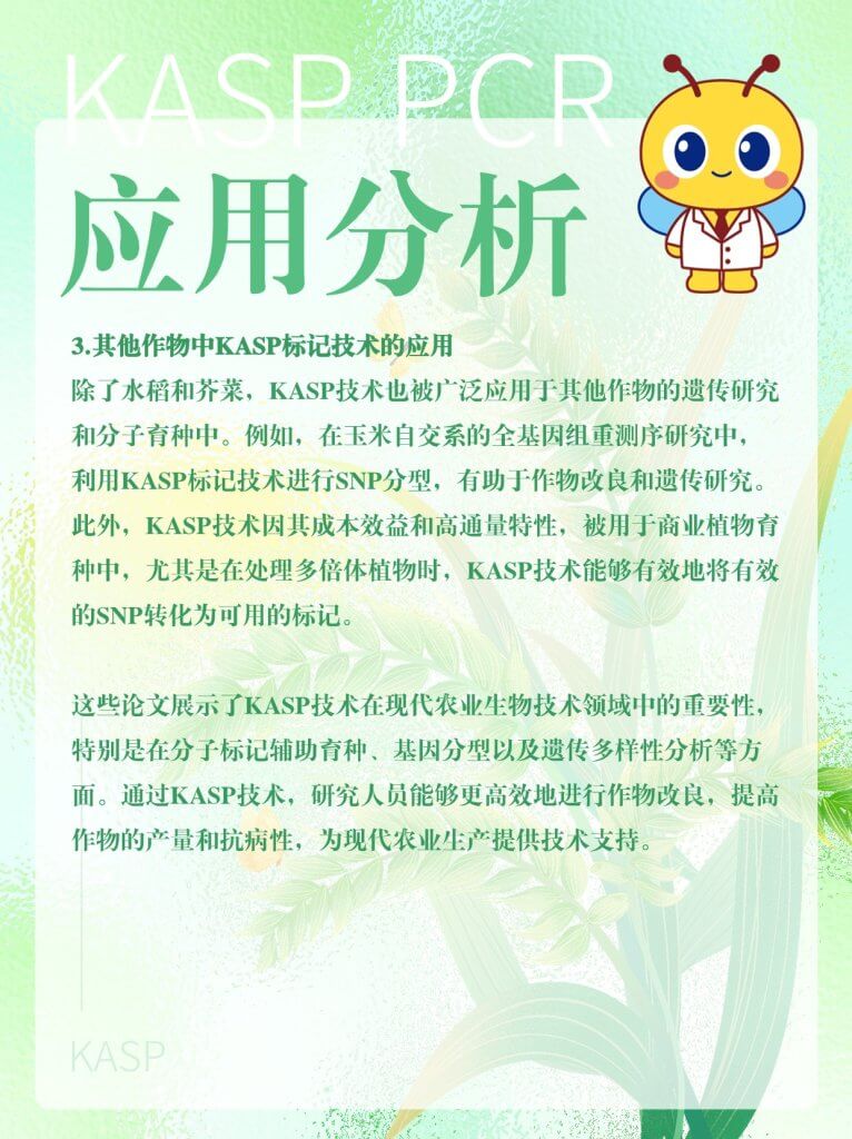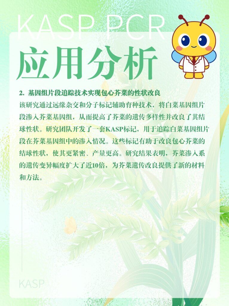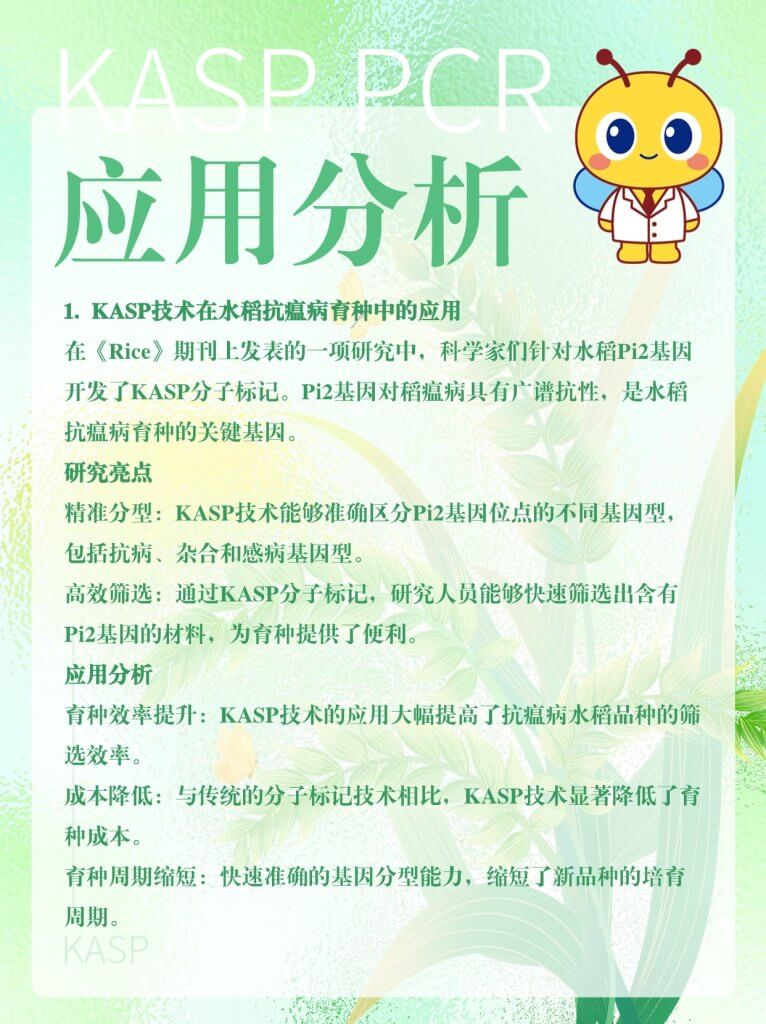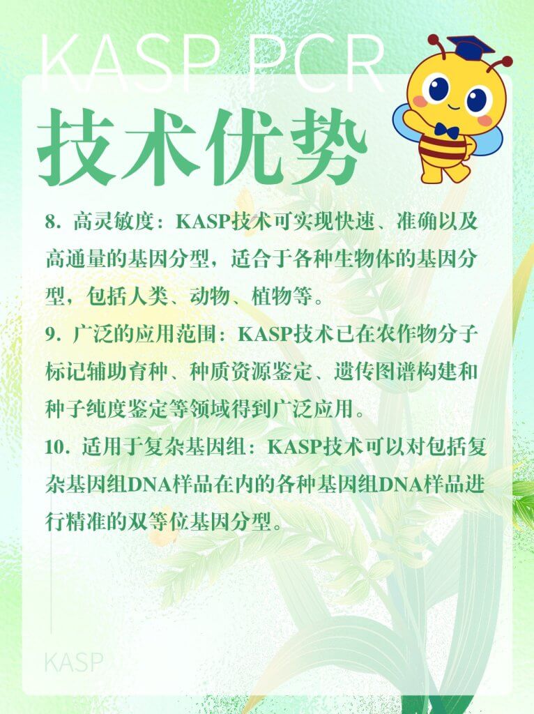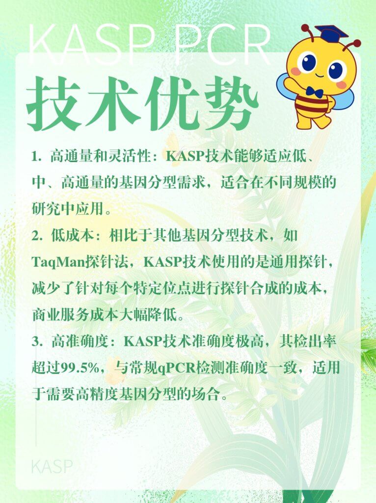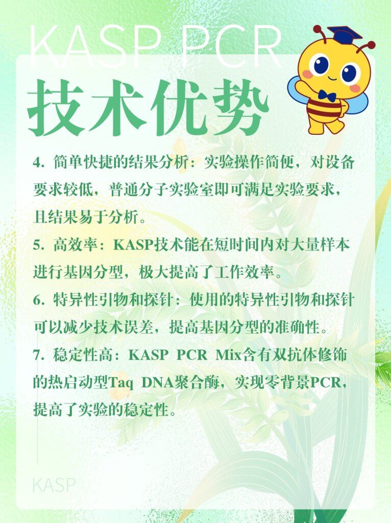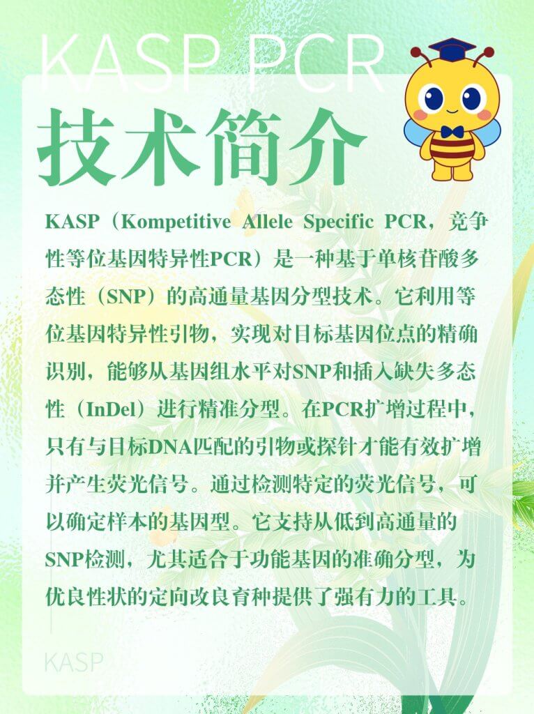 KASP(Kompetitive Allele-Specific PCR,競爭性(xing)(xing)等位基(ji)因特(te)異性(xing)(xing) PCR)是(shi)一(yi)種(zhong)用于(yu)基(ji)因分型的技(ji)術(shu),基(ji)于(yu)等位基(ji)因特(te)異性(xing)(xing)PCR。它使用一(yi)種(zhong)獨特(te)的競爭性(xing)(xing)PCR機(ji)制,能夠(gou)檢測特(te)定位點的單核苷(gan)酸多態性(xing)(xing)(SNP)和(he)(he)插入/缺失(shi)(InDels),具有(you)通量高、成本低和(he)(he)可操作性(xing)(xing)強等優點,在農作物性(xing)(xing)狀(zhuang)遺傳和(he)(he)改(gai)良研(yan)究等領域(yu)具有(you)廣泛的應用。